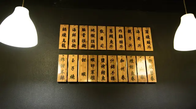 店內色調以黑紅兩色為主,牆上掛著部分菜色的小木牌