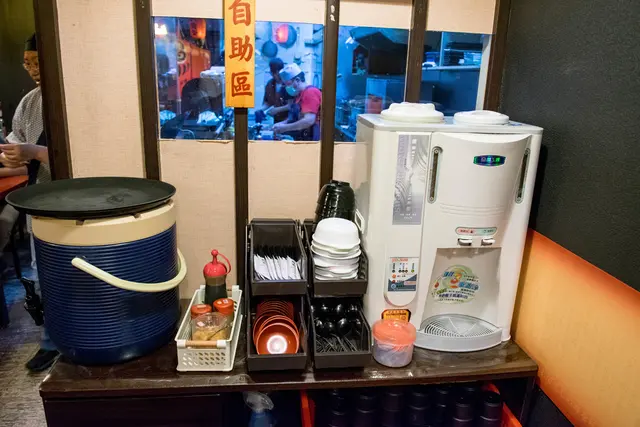 一旁有麥茶、開水、調味料及餐具可以自助取用