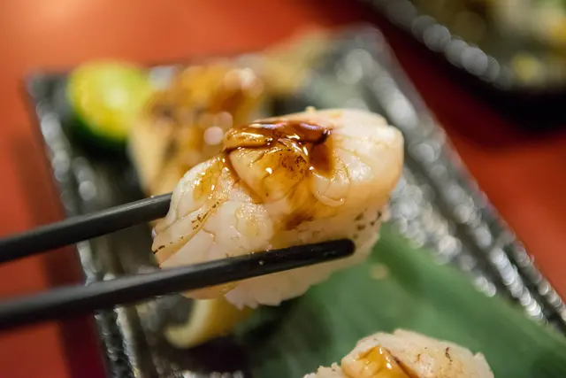 厚實的炙燒干貝同樣令人食指大動,裡頭保持生食、軟嫩鮮美的口感