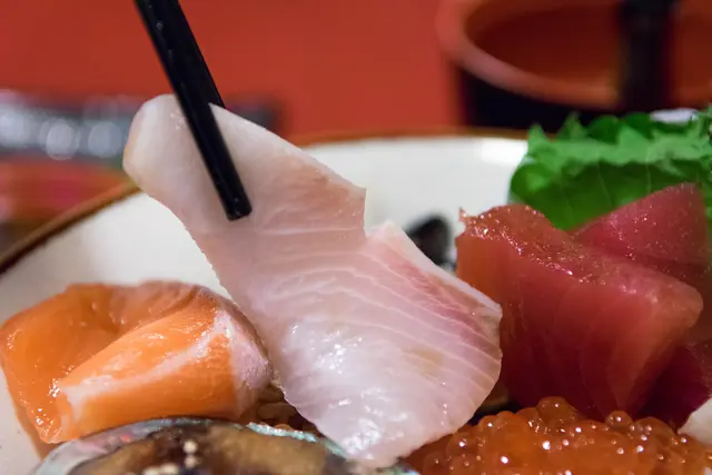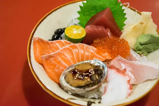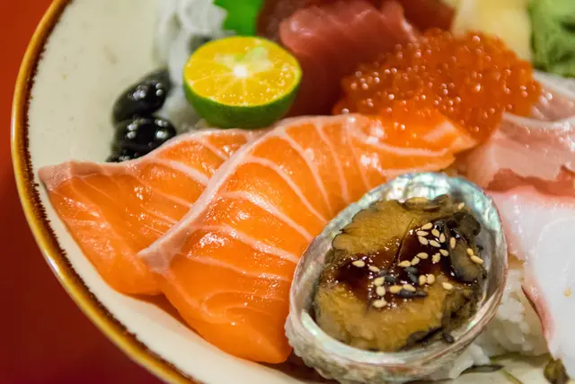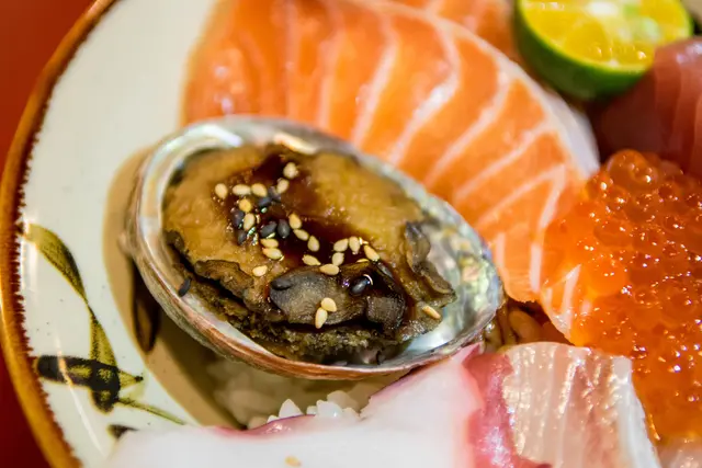 滿滿一匙魚卵,各式生魚片包含鮭魚、鮪魚、紅甘等等,以及一顆鮑魚,厚度都頗大方