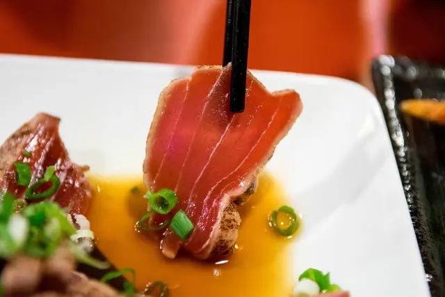 撒上和鮪魚絕配的蔥花,沾上哇沙比和特調的柚子風味醬油,別有一番風味