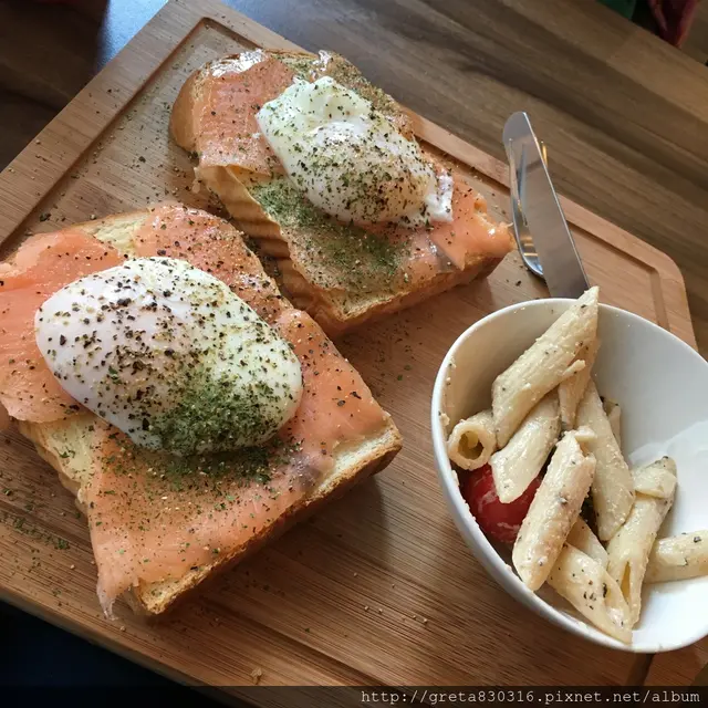 餐的話就是水波蛋燻鮭魚吐司兩片和一小碗的義大利麵