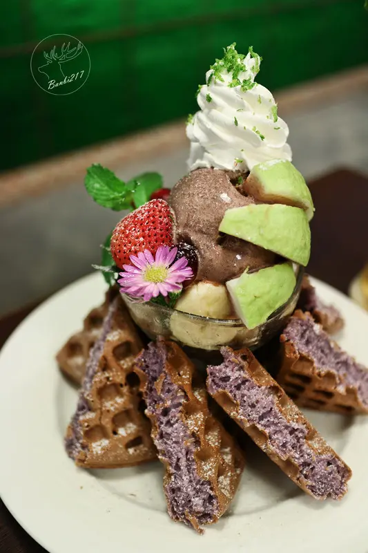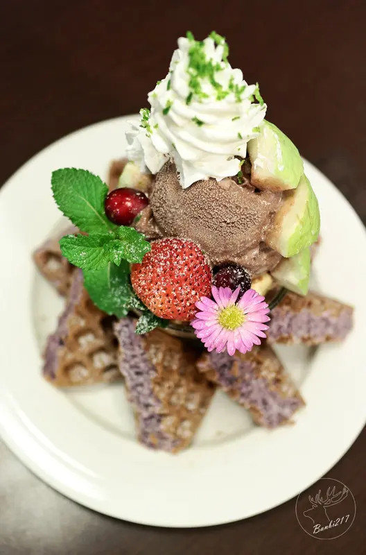 鮮奶油還特地刨上了新鮮檸檬皮以增添香氣與增加清爽感,中間用冰淇淋杯承裝杜老爺巧克力冰淇淋、草莓、香蕉、芭樂、蔓越莓(水果依季節替換)這樣較不會因為冰淇淋或是水果與鬆餅的溫差而影響鬆餅口感。