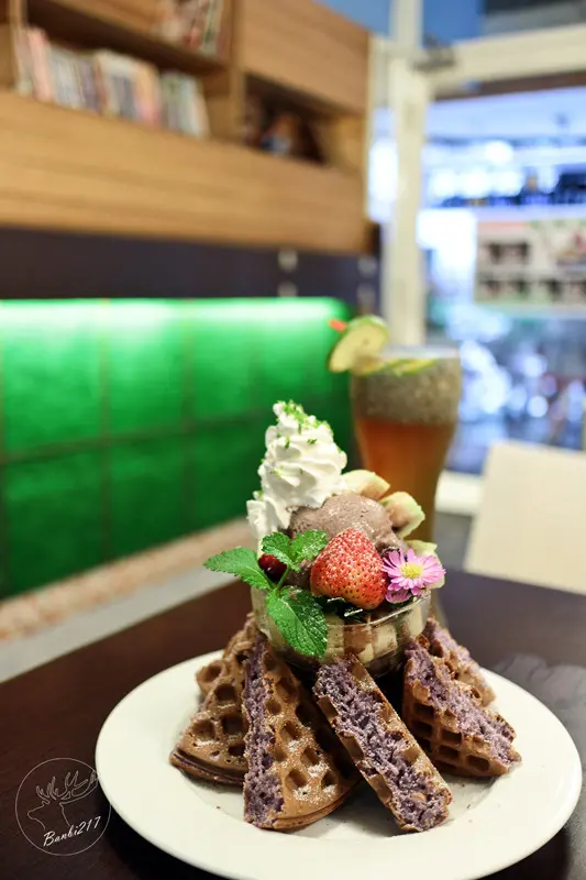高聳的紫色薰衣草鬆餅與花朵、綜合水果、巧克力冰淇淋的搭配,好適合春天原野感覺的特別鬆餅口味與擺盤方式,這是我見到紫芯塔羅薰衣草鬆餅的第一印象。