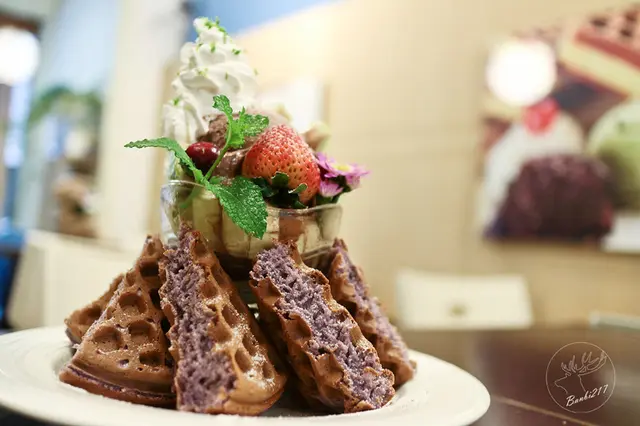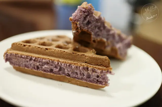 一口咬下便發出卡滋聲,外皮真的好脆啊!鬆餅外脆內鬆軟,還有薰衣草香氣,在品嘗的時候還可以吃到薰衣草花,沒想到板橋也有如此不錯的鬆餅,以後吃鬆餅不用特地跑到台北排隊了。因薰衣草製作出的食品顏色很淡,老闆表示鬆餅的顏色是來自於芋頭粉的色澤,另外建議大家鬆餅這現烤的食品要趁熱吃感受那酥脆與鬆軟口感才好!