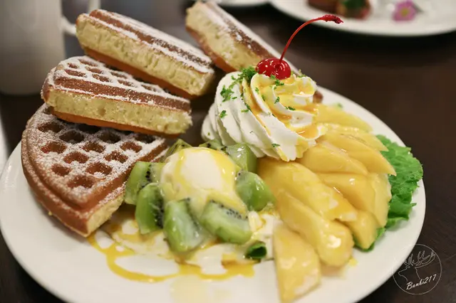 鬆餅同樣很酥脆而內很鬆軟且不會乾,上方灑有些許糖粉,整體吃起來還能感受到蛋香氣。雖然芒果才剛出現,但芒果的部分甜度很夠,而且給的分量很多,對我這芒果控來說吃起來很過癮,所以和紫芯塔羅薰衣草鬆餅我更喜歡天堂鳥芒果鬆餅,滿足能大口吃許多芒果的感覺。