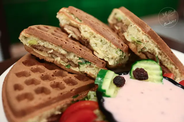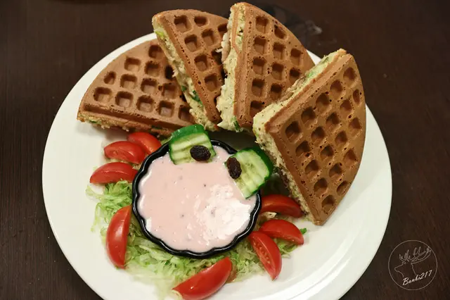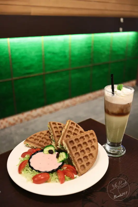 吃了甜的鬆餅想來點鹹口味的,小虎推薦的冰火立方體鬆餅當日無供應,於是我們改點選這款福爾摩沙蔥爆豬肉鬆餅。附帶一提桑葚酒醋醬搭配葡萄乾、小黃瓜、小番茄的造型像極了螃蟹,還挺可愛的。