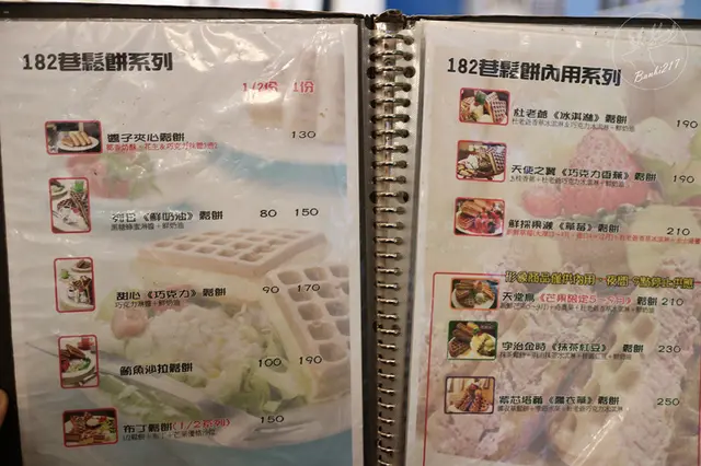 從最受一般大眾歡迎的草莓鬆餅、巧克力鬆餅外,菜單上看過去發現182巷鬆餅廚房提供的口味種類很多,無論是椰香奶酥、黑糖蜂蜜淋醬與鮮奶油、鮪魚沙拉、布丁、杜老爺冰淇淋、巧克力香蕉、宇治金時抹茶紅豆,或是5-9月限定的天堂鳥芒果、薰衣草,這些多樣化的鬆餅讓食客們也能有多種選擇。菜單與售價可參考:182巷鬆餅廚房菜單。