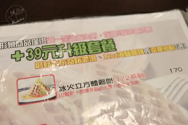 若下午時間想搭配鹹點的話也有特別的鹹鬆餅可選擇,另也可加價$39元升級成套餐,可惜造訪時冰火立方體鬆餅當日無販售。
