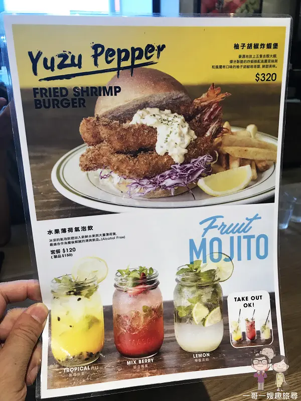 芒果雪酪舒芙蕾鬆餅和柚子胡椒炸蝦堡以及梅森杯裝著的水果薄荷氣泡飲。