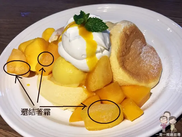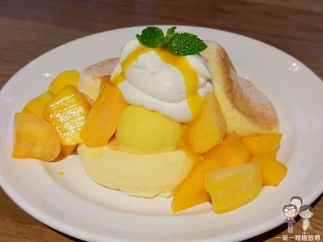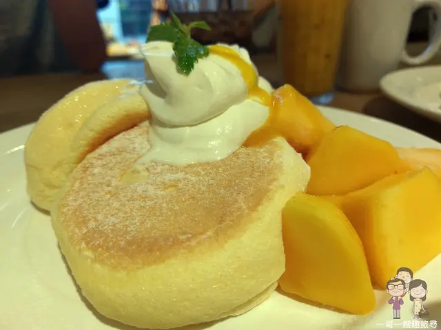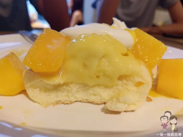 接著換季節限定的芒果雪酪舒芙蕾鬆餅NT.360元來試試。