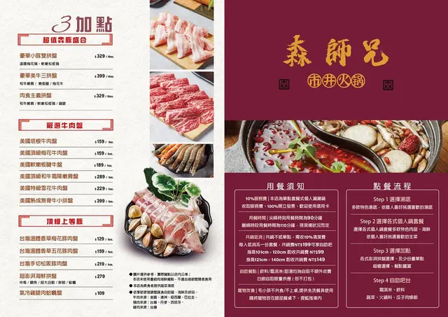 森師兄市井火鍋菜單上有點餐的方式介紹,原則上要先選湯底,總共有9種湯底,不用加價的是大骨湯,但是只個超推薦選加價湯底,像是招牌麻辣鍋才60元,裡面麻辣鴨寫豆腐,還能免費續加,整個很值得,第二就是選鍋物主餐,有肉盤跟海鮮,肉盤都有分大小份,配菜跟蔬食的部份有30多種隨便你挾,點最便宜的339元火鍋真的就是讓你吃到飽,有收服務費10%。