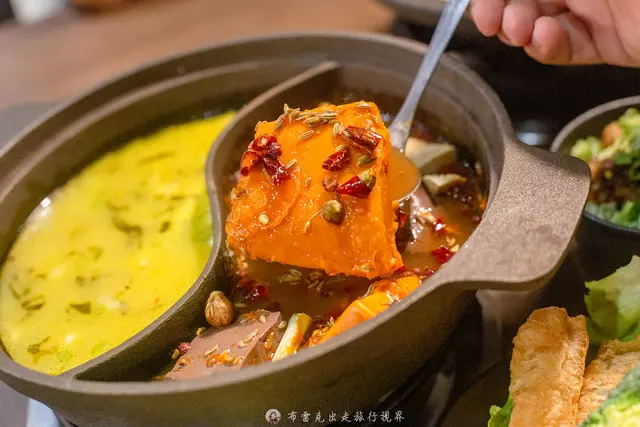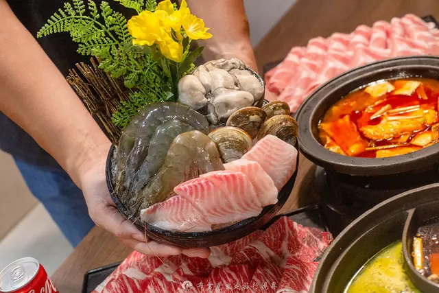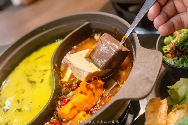 加價100元就可以做鴛鴦鍋,麻辣、蕃茄、金湯跟菌菇四選2,所以我們就做了一個麻辣配老譚酸菜金湯,其實計很像是酸菜魚的湯底,酸味道帶有一些麻,最後會有南瓜回甘的甜味,蠻有層次的,而且加魚片下去煮也是相當不錯。