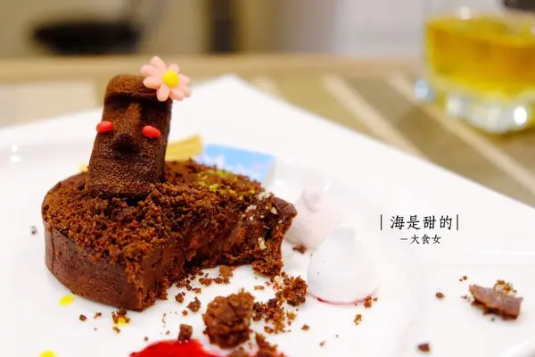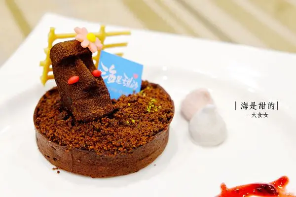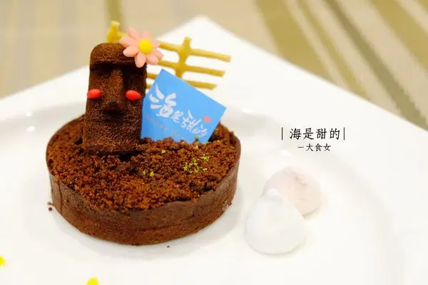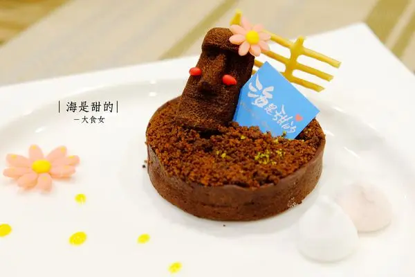 摩艾坐在生巧克力塔上頭,當天叉子輕輕一劃,上頭的土壤也隨之傾瀉而下...,
