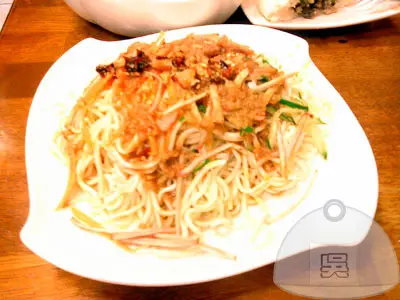 我老婆說這家的涼麵”粉”好吃!因為很少店面加的花生粉是有顆粒感的。另有Q的麵條,及切絲的叉燒肉、小黃瓜、紅蘿蔔,最後淋上微酸中帶辣的醬汁。爽口程度,真會讓人一口接一口。