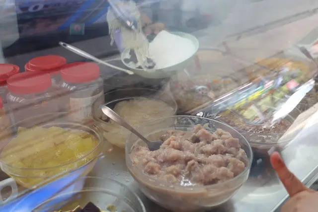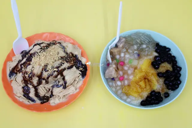 良 古早味黑糖剉冰有一些古早味的配料,像是粉粿、黑糖粉糖、粉條等。