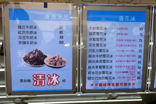 主要販售各式牛奶冰、剉冰、還有雪花水。雪花冰都會加醬或煉乳是可以更換的喔!依照市場價錢來看,雪花冰的價錢蠻親民的。
