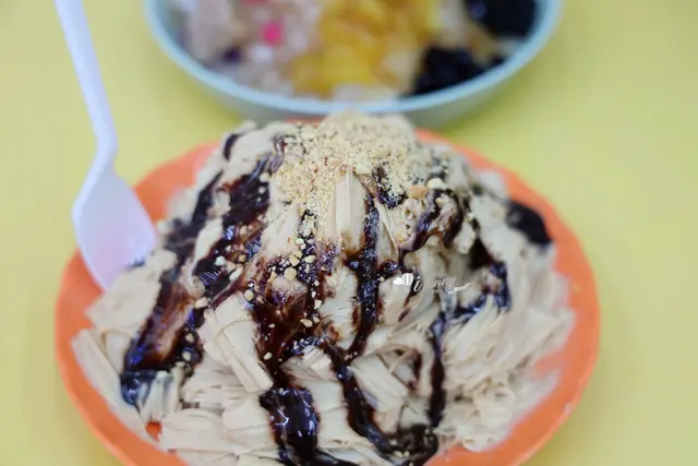 花生雪花冰從冰磚就是花生,然後淋醬也是花生,然後最上面是硬花生碎,只是姐妹突發奇想地加了巧克力醬。