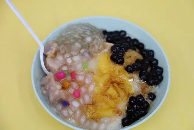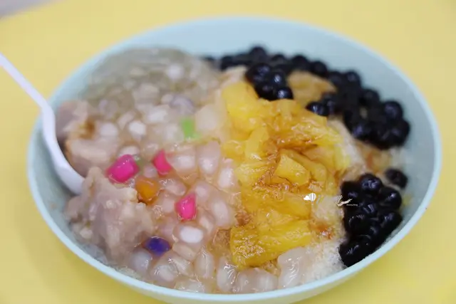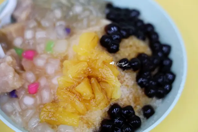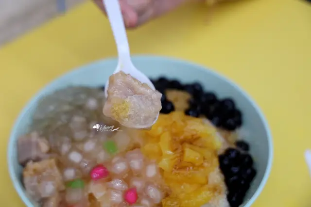 原本是黑糖冰磚剉成冰,但因為我們要求半糖,所以變成清冰再淋黑糖醬。自選5種配料,我們選了芋頭、脆圓、珍珠、粉條及鳳梨。脆圓就是比珍珠更有嚼勁一些,吃來牙齒更忙一點,也是咀嚼上的樂趣。