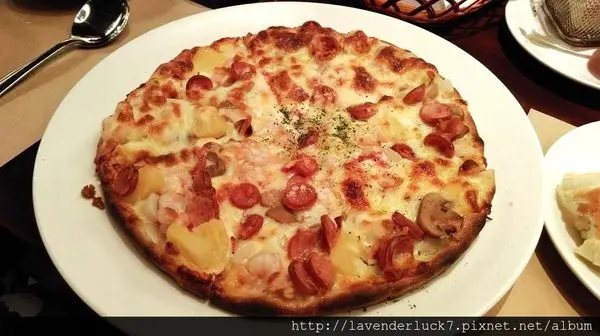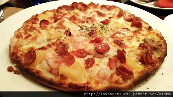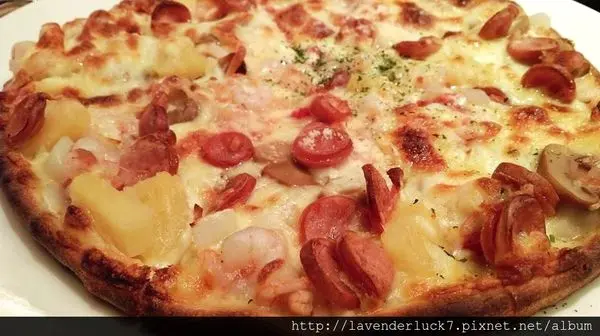 滿滿的德國香腸.火腿片.蝦仁.鳳梨與磨菇
