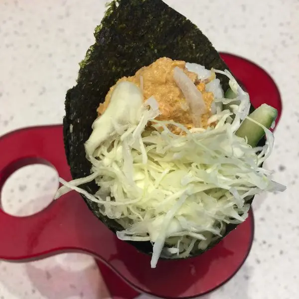 因為是衝著新品而來,所以馬上點了「蟹膏散壽司」、「蟹膏手卷」各一份,覺得吃蟹本身很麻煩(懶),就沒有點另外兩樣,但看到在迴轉盤上很大一隻,目測這樣$30一份不算貴!