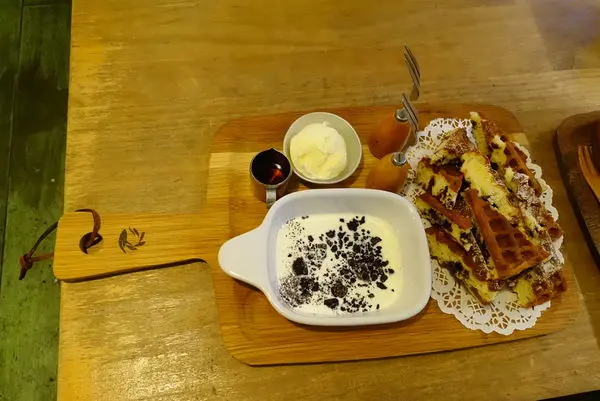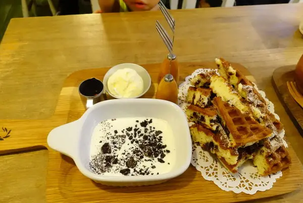 招牌鬆餅好香 鬆軟好吃 份量也不少 好美味 吃原味就很棒 鬆餅裡夾著巧克力 不會苦 也不死甜 鬆餅更不會乾 就連餐具都很可愛喲