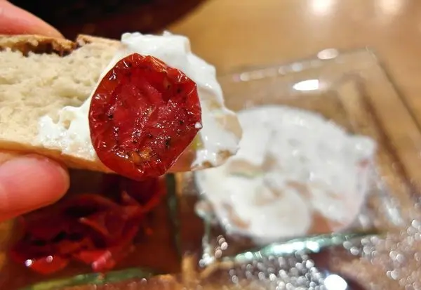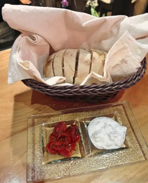 主餐附上的窯烤麵包和沾醬(酸奶/油漬蕃茄)