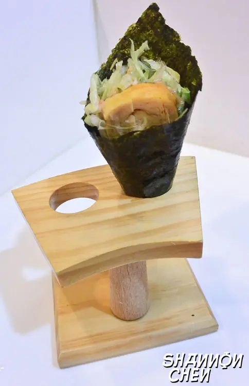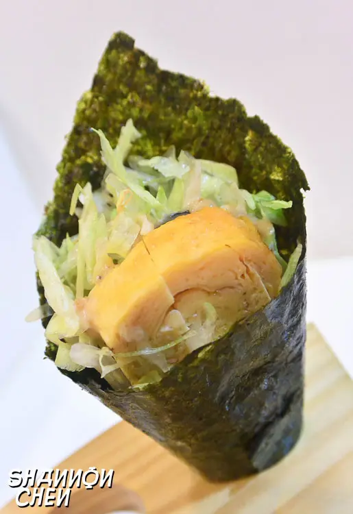 玉子手捲第一次看到,一口咬下嘴裡滿滿的玉子的香甜味,剛剛好不會太甜,加上裡頭的醬料,