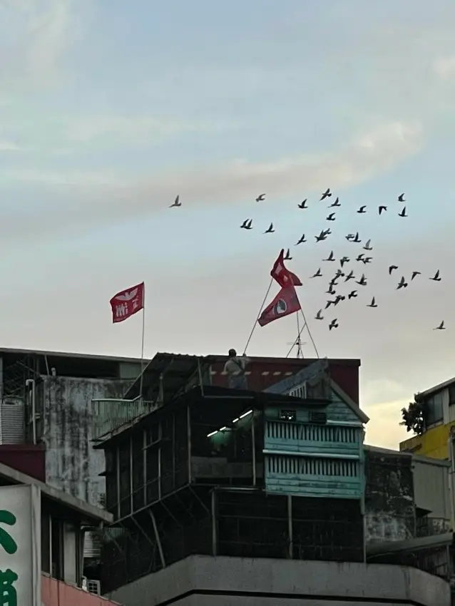 回程陪牛爺到雞飽外帶個便當,肥魯在門外等侯,剛好看到遠方樓頂的大哥正在放飛鴿子~