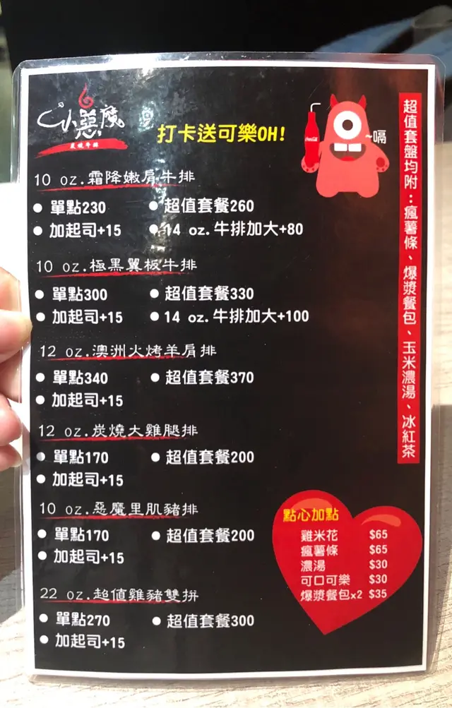 超值的牛排!抵!絕對是平靚正㗎! sisisasa8Level 12018-12-13144 views Follow 早前看到別人推介,小惡魔的牛排平靚正!作為旅客的我當然要一嚐其美味啦!一落機放低行李後就動身去,位置來說也不難找,捷運出站後行十分鐘左右,因之前看過評論,晚膳時段會排長龍,所以選了五點半左右到,不算多人。揀了個「極黑翼板」套餐,因當天天氣比較寒冷及有雨,當員工送試一碗熱騰騰的粟米湯時真開心呢!兼且很好飲呀!👍👍👍因人不多送餐時間也很快!牛扒、薯條、少量蔬菜上碟!正!✌️ 肉質一流!三百多台幣來說絕對值回票價!換轉在香港都很難找到!值得下次再嚟啊!任君選擇The above review is the personal opinion of a user which does not represent OpenRice's point of view.LikeShare超值的牛排!抵!絕對是平靚正㗎! 小惡魔炭燒牛排 https://s.openrice.com/cHKTmG2bmG200Report Post Ratings--Taste5Decor5Service5Hygiene--ValueDate of Visit2018-12-08Type of MealDinner