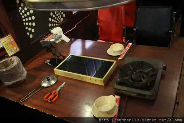 從最左邊的調味罐(胡椒/鹽)、面紙、餐具、火鍋爐、烤架、小三機