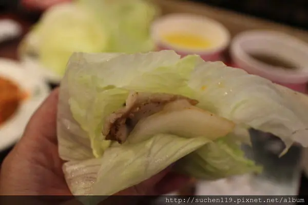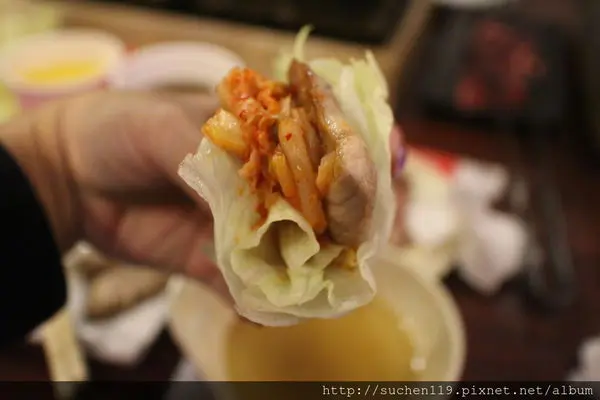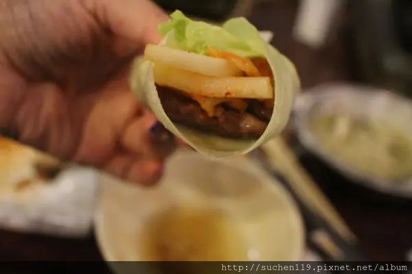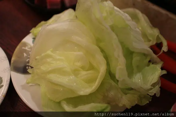 生菜裡夾著客家鹹豬肉、台式泡菜在口中激盪出美妙的口感!!