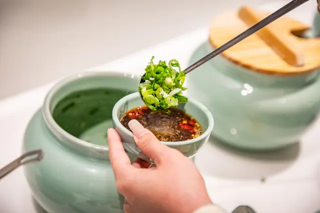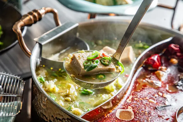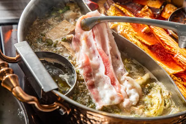 青麻椒肥牛鍋是青花驕餐廳的招牌鍋底,以其獨特的綠色麻辣湯底著稱,由於使用了特製的青麻醬和重慶九葉青花椒,其香氣和味道都非常出眾,湯底中滿滿的青辣椒切片更增添了這個鍋底的特色,雖然鍋底的價格略高,但來到青花驕就一定要吃看看這裡才有的好味道!