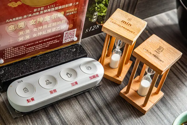 座位旁邊還有設置服務鈴呢,有需要都可以直接按請服務人員過來,旁邊蛤有兩個時間不同的沙漏,煮麵、或一些需要煮一段時間的食材非常好用