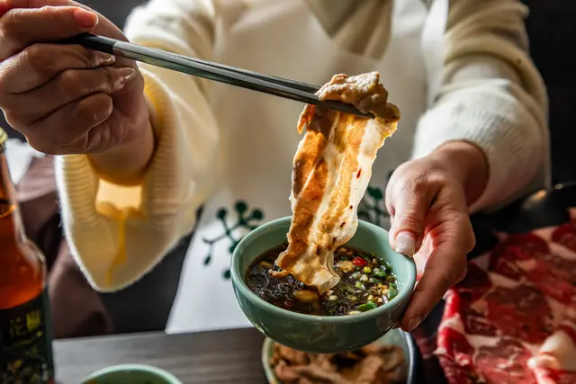 青麻椒肥牛鍋點餐時會附贈「特選肥牛盤+東坡烤麩」,肥牛最佳的烹調方式是涮煮至五分熟,這樣可以保持其滑嫩口感且不會過於油膩,至於東坡烤麩,則是一個相當有創意的食材,包裹著香菇和絞肉。烤麩在湯汁中吸收了麻辣和甜味,再加上肉香,非常美味