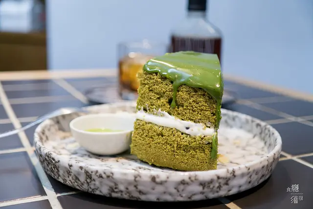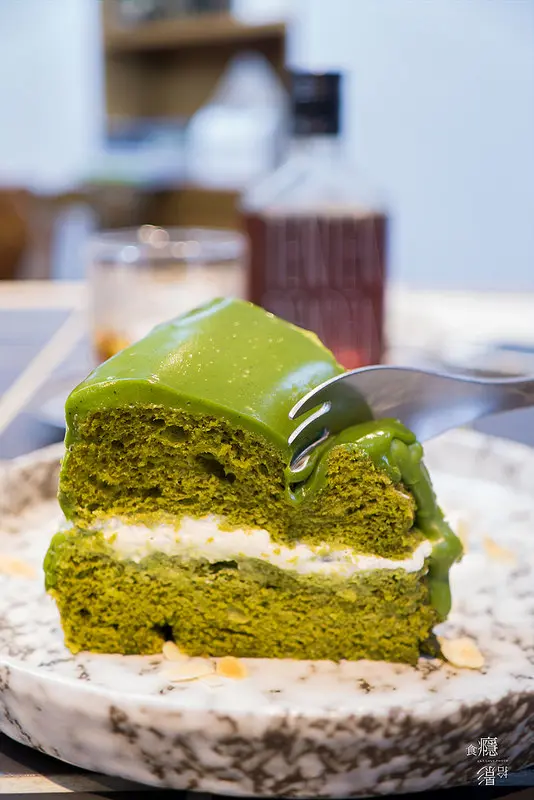 除了綠色的蛋糕體,上方淋上的濃稠醬汁也是誘人的抹茶色,