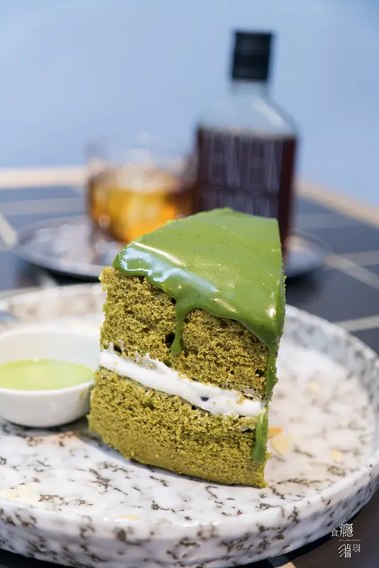 除了綠色的蛋糕體,上方淋上的濃稠醬汁也是誘人的抹茶色,