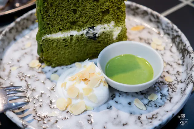 ▲大家應該有注意到一旁小碟子上的綠色醬汁,那便是這塊蛋糕的靈魂角色、精華所在,