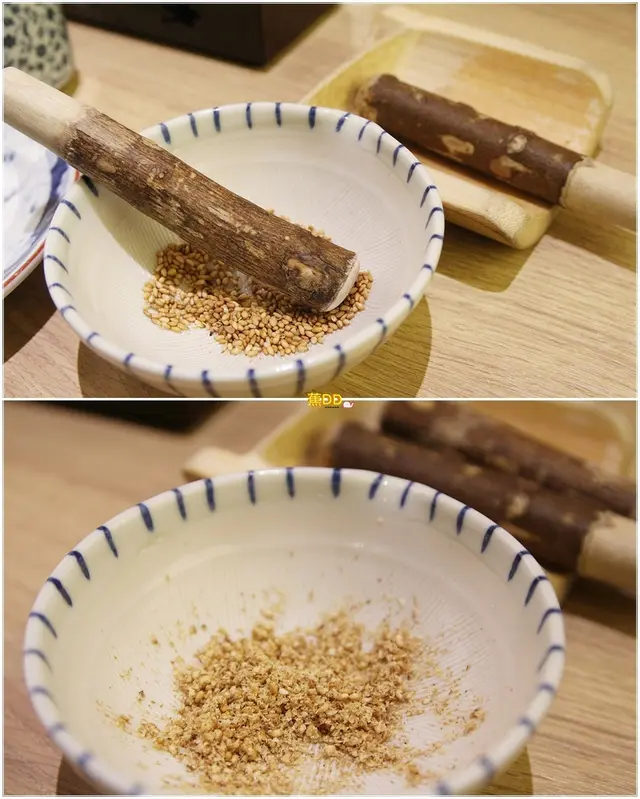 ▼店員先上研磨餐具及小菜,磨具為山椒棒及日本嚴選金胡麻,更增添豬排醬的層次感