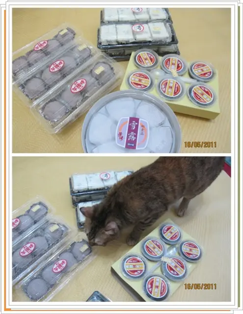 我的戰利品-6盒芋泥球、4盒雪花糕、1盒雪露、1盒布丁,連郭虎咩都迫不及待想吃啦!
