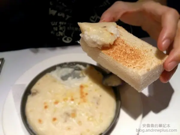 焗烤蘑菇 + 方塊麵包 - 這道是萬年餐色了吧~好像從來沒換過,不過焗烤蘑菇有點味道不同,不過我還是依照十年來的習慣,麵包只吃一片然後直接把焗烤蘑菇吃光光!