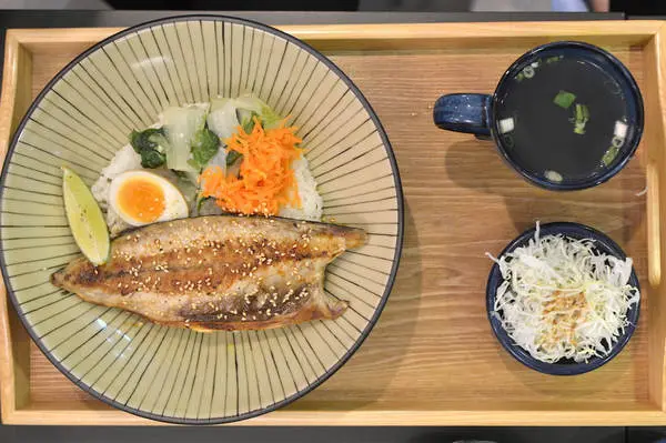 餐盤和餐碗很有日式食堂風情,鯖魚肉質鮮美飽滿,滴上檸檬汁更提味,