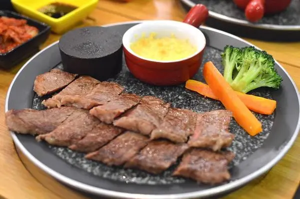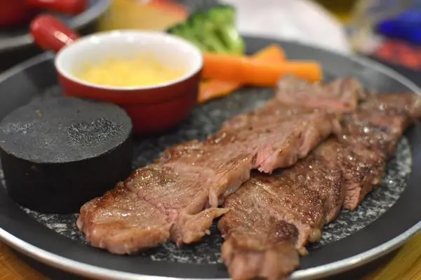 ​牛排厚度明顯比翼板牛排厚實,將牛肉切面放在熱石上燙熟,炙燒過表面更酥,