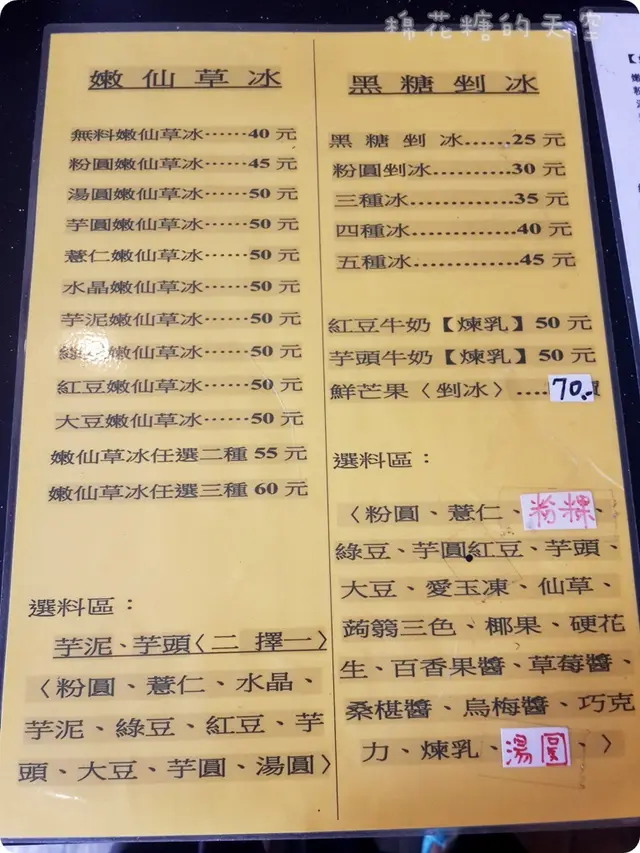 先來看看店家的菜單吧!配料大多是傳統剉冰的配料~冰底的部分分成嫩仙草和黑糖的,但是這裡的重點就是要吃嫩仙草冰的啦!這邊的仙草冰可不是外面吃得到的唷!
