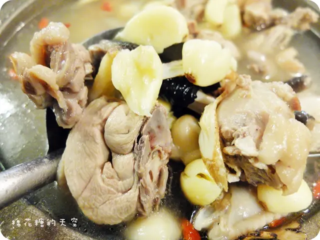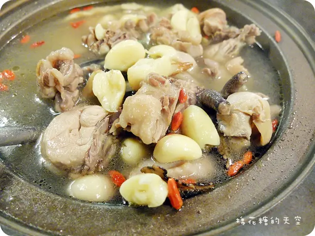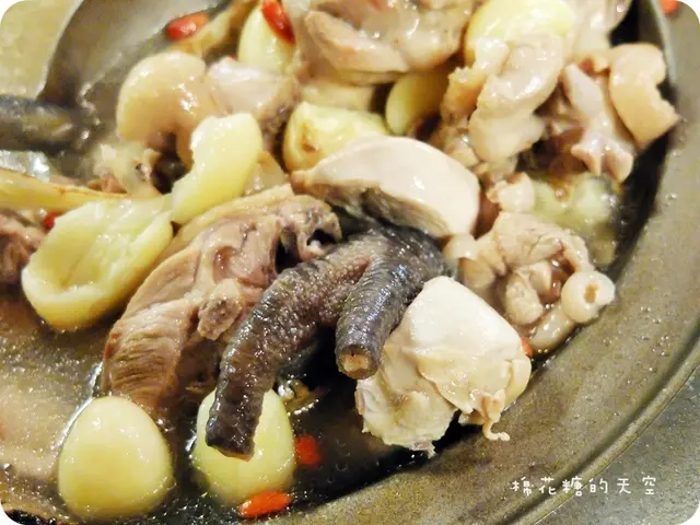 看看這些犯規的雞腿肉~還有熬煮到鬆鬆“桑桑”的蒜頭們!裡頭也是加了不少的中藥材唷~沒有因為身處在山上就偷工減料唷!清甜的湯頭~會讓人一碗接一碗的喝下肚子,而且這味道小朋友朋友的接受度也很高,一定要一家大小來吃補、看夜景的啦!