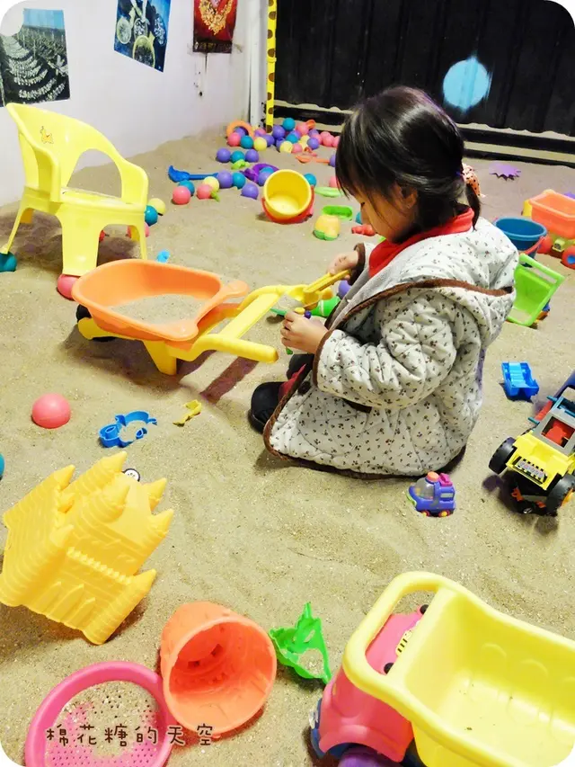 帶小朋友一起來~爸爸媽媽最怕小朋友不乖乖待在餐廳啦!老闆娘自己也有小孩~所以深深知道爸爸媽媽的痛苦,特別在餐廳裡面打造了兩大遊戲區域。第一個就是這室內的沙坑堆城堡區囉!小朋友一走進來目光馬上被吸引住了~