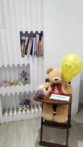 就是一隻可愛的小熊坐在兒童椅上拿著鮮黃色的氣球真是可愛!