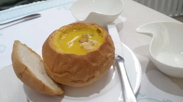 熱呼呼的非常順口、好喝~邊舀邊挖一旁的麵包壁,浸潤著滿滿的南瓜湯香氣,有口感又好喝啊~