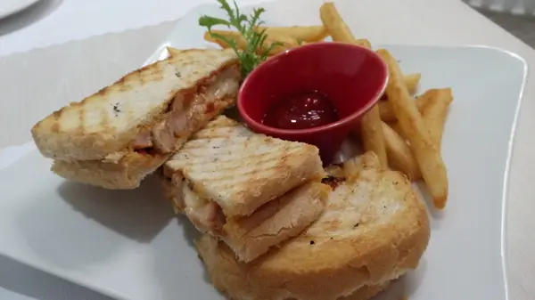 隨即又吃這道,感覺有點乾。裡頭雞肉Q嫩,店員送上餐點時都會稍為說明一下有提到這道餐點是使用溫體雞隻去骨的雞腿肉喔~這道感覺像是在吃紅醬雞肉義大利麵,只是將麵條改成烤吐司! 起司、雞肉都偏多喔。