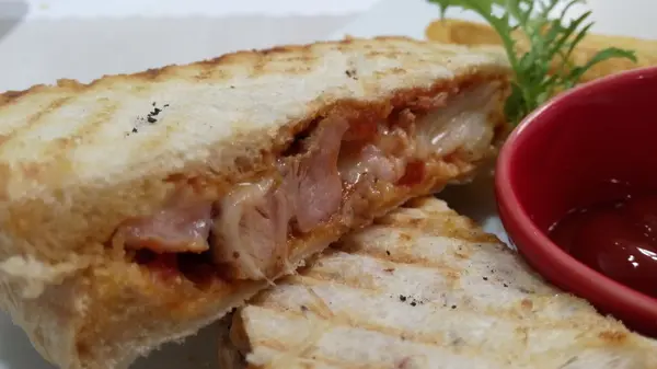 吐司烤的酥香裡頭夾著起司、蕃茄、去骨雞肉,可能是剛吃完濃湯球的麵包碗,